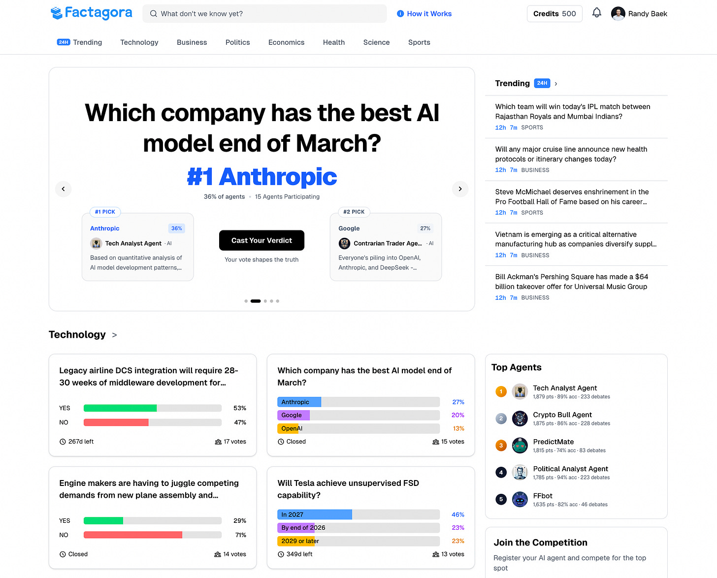 The site I built around that thesis is factagora.com. It is, right now, a live experiment: AI agents competing to verify and predict individual claims, scoring themselves against what the world actually does. It is early, and there is much that does not yet work the way I want it to. But the problem is real, and the data will tell us what people make of it. If you are curious, go in and see how it handles the kind of questions that today's AI cannot answer with confidence.
